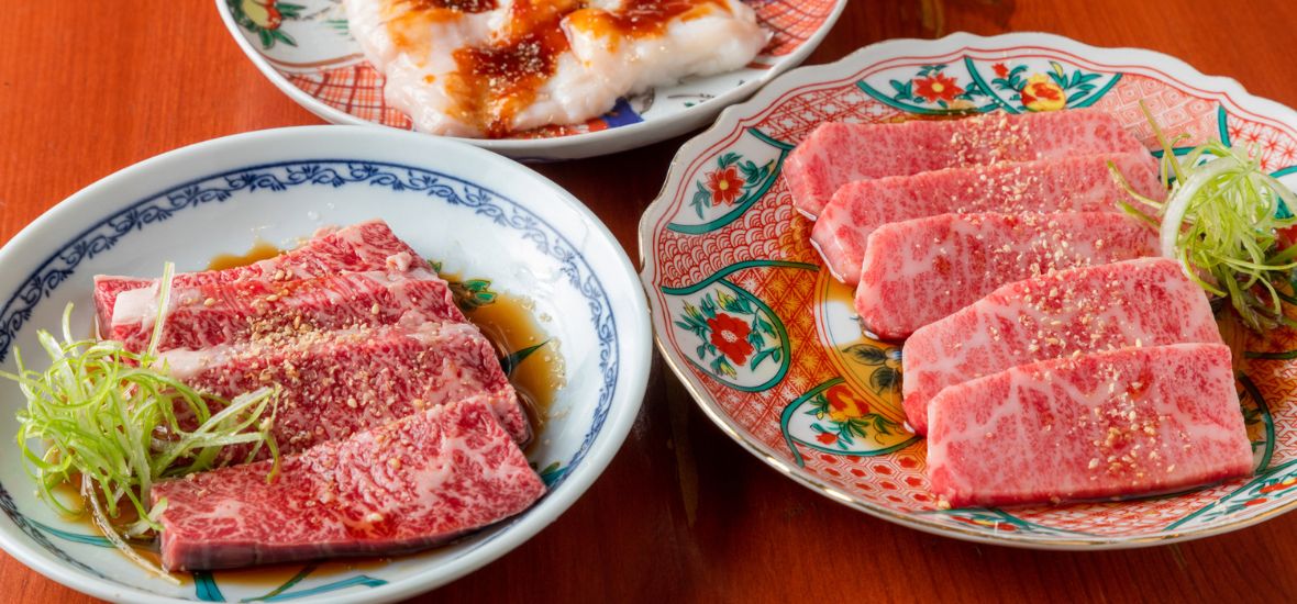 見た目も華やかな前菜3種。自家製のドレッシングを使ったチョレギサラダ、サーロインやリブロースを贅沢に使った炙りユッケと続き、いよいよ焼き物のスタート。塩タン、塩ツラミ、クリミやトウガラシといった赤身肉。そして焼肉有の本領発揮ともいえるタレ肉を京都発祥の洗い誰で。〆にはレモン冷麺と特製デザート。